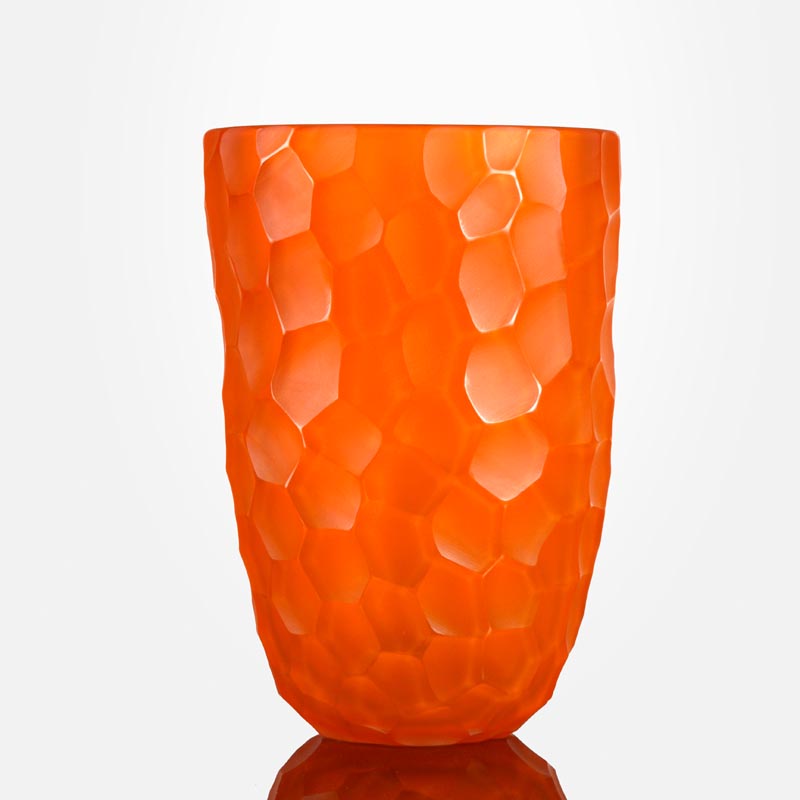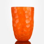 Vaso grande in vetro realizzato a mano dal maestro Alberto Donà in colore arancione molato a mano con la tecnica della BATTITURA. Il vetro esce dalla prima fase della lavorazione con una superficie liscia ed omogenea.Successivamente passa nelle mani del maestro molatore il quale con l’aiuto di una ruota di diamante scolpisce il vaso fino a scavare il vetro e creare il disegno desiderato.