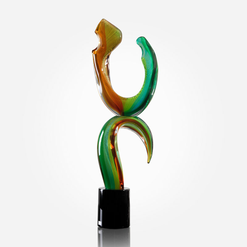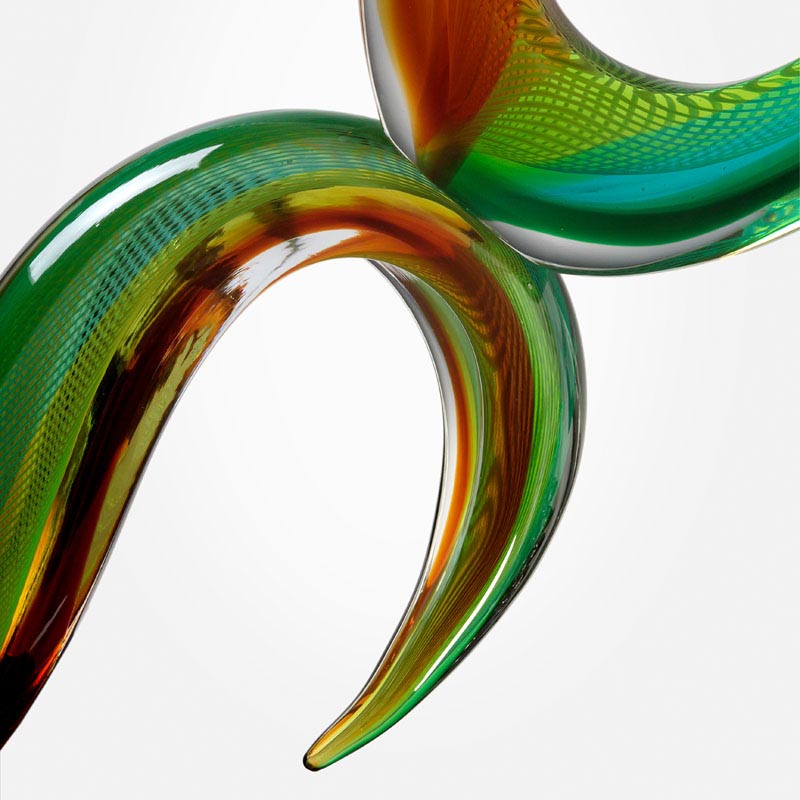 scultura Gondola su Onda in vetro realizzata a mano dal maestro con decoro in filigrane e zanfirico in color verde e topazio.